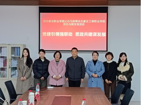 为深入贯彻落实河北省教育厅《河北省公办高校帮扶民办高校思想政治理论课工作方案》,10月30日,河北政法职业学院马克思主义学院院长常满荣及思政课骨干教师一行,赴石家庄工商职业学院马克思主义学院开展专题帮扶调研,与河北农业大学马克思主义学院教授、河北省高校公办高校帮扶民办高校思想政治理论课工作组思政课教师科研能力提升组负责人郭跃军、石家庄工商职业学院马克思主义学院院长刘海燕开展交流座谈。